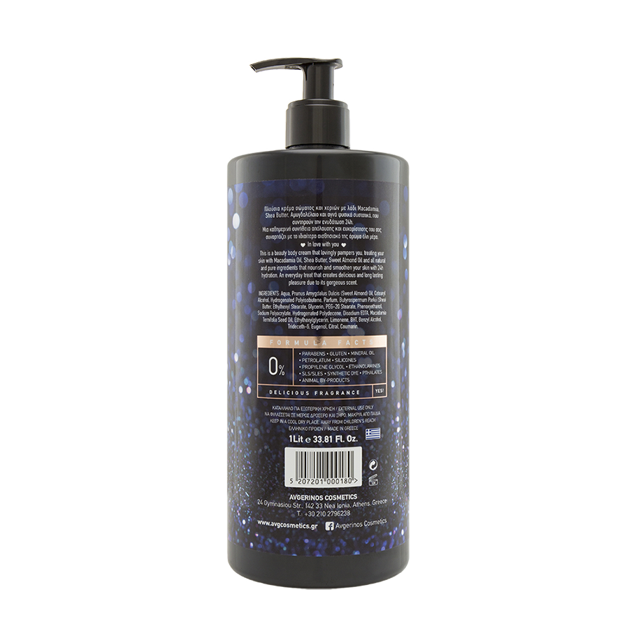 Πλούσια κρέμα για το σώμα με έλαια macadamia ,αμυγδάλου και βούτυρο karité (shea butter) για πλούσια ενυδατική δράση που αποτρέπει την απώλεια υγρασίας χωρίς να λιπαίνει την επιδερμίδα και απορροφάται άμεσα.